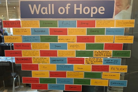 The Wall was built with the words ‘inclusive’, ‘dreams’, ‘independence’ and ‘resilience’, and messages included ‘For children and young people with ABI to been seen as children first, ABI second’.
